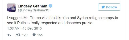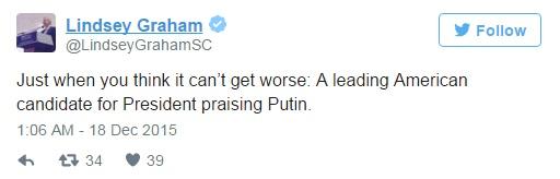 Ο Ρεπουμπλικάνος γερουσιαστής Λίντσεϊ Γκράαμ, επίσης υποψήφιος για το προεδρικό χρίσμα, κριτίκαρε με δυο αναρτήσεις του τόσο τον Τραμπ όσο και τον Πούτιν, λέγοντας πως είναι αδιανόητο να βλέπει έναν υποψήφιο πρόεδρο των ΗΠΑ να μιλάει τόσο κολακευτικά για τον Ρώσο πρόεδρο.