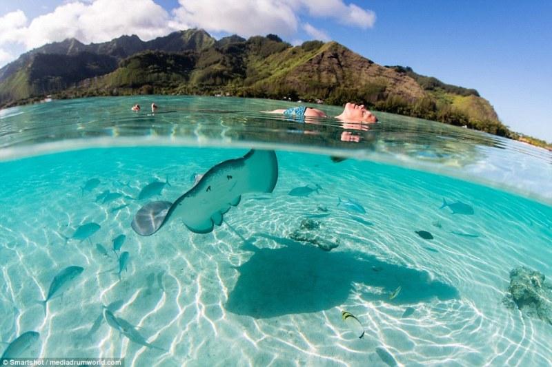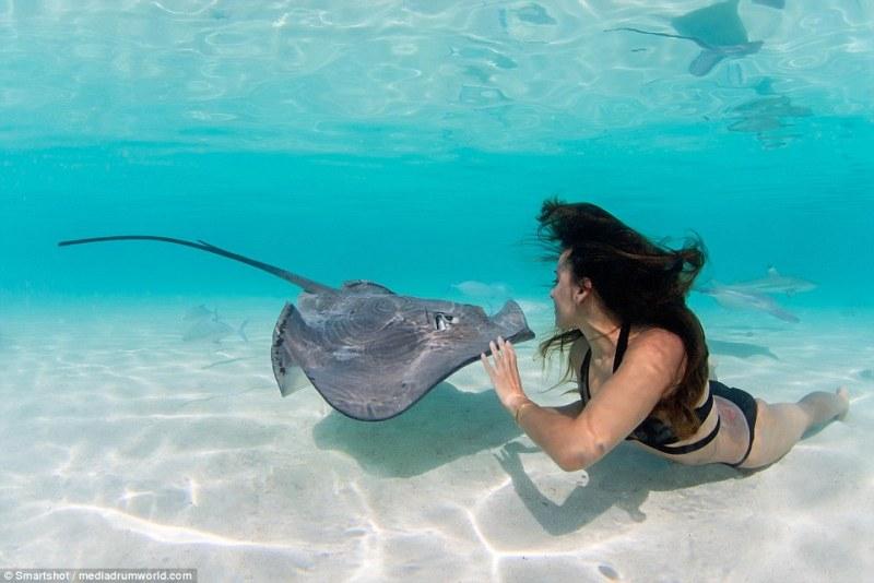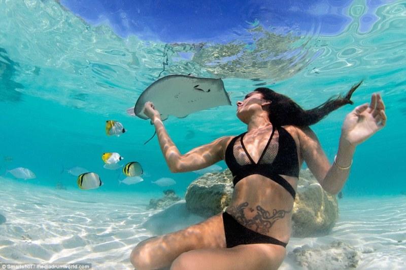Τώρα ένας 55χρονος φωτογράφος ο Κρίστιαν Κουλόμπ, απαθανατίζει στα υπέροχα γαλαζοπράσινα του νότιου Ειρηνικού, γυναίκες μοντέλα να χορεύουν στο βυθό μαζί με 20 επικίνδυνα σαλάχια.