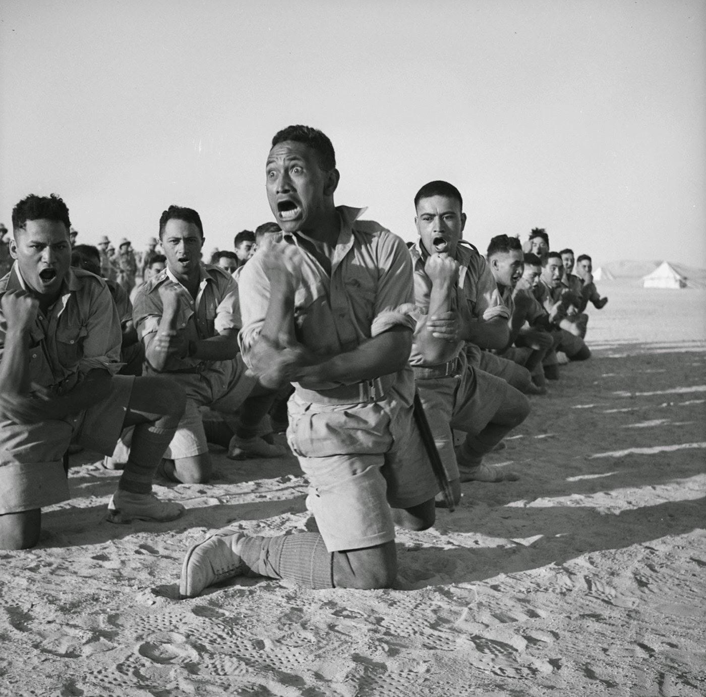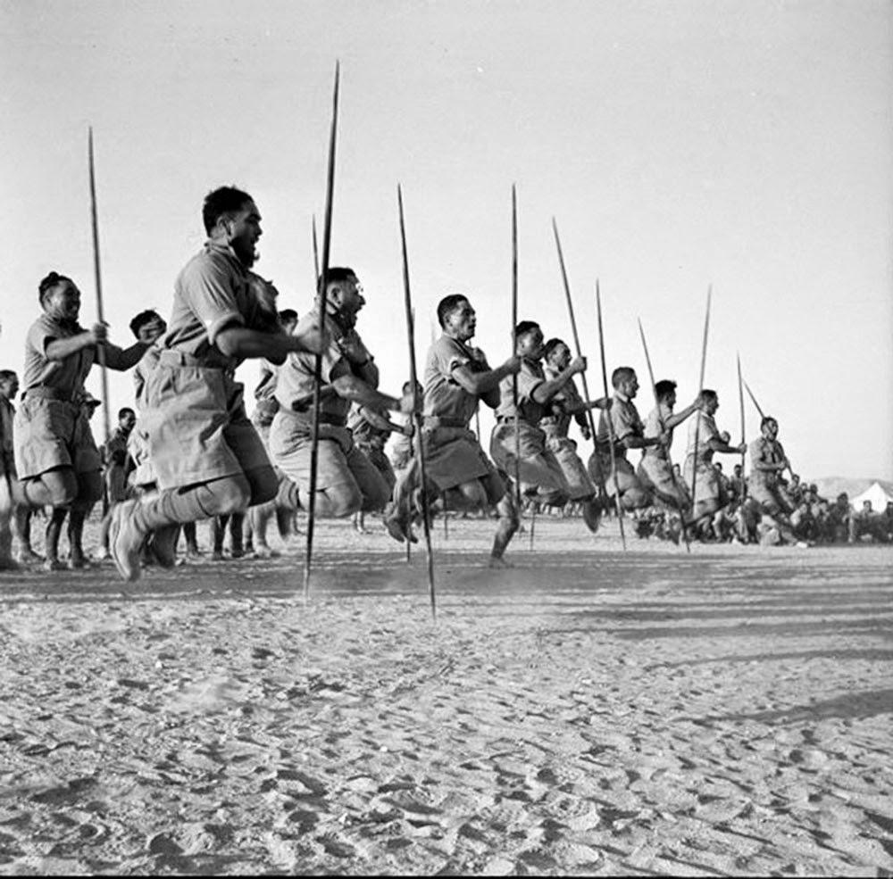 Μέλη του τάγματος Μαορί των Νεοζηλανδικών ενόπλων δυνάμεων χορεύουν τον παραδοσιακό χορό χάκα, μπροστά στον Έλληνα βασιλιά Γεώργιο ΄Β, το 1941 στην Αίγυπτο.