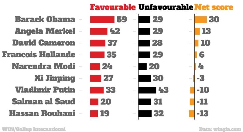 Ο Μπάρακ Ομπάμα και ο Βλαντίμιρ Πούτιν είναι μακράν οι πιο αναγνωρίσιμοι ηγέτες στην παγκόσμια πολιτική σκηνή. Παρά το γεγονός ότι ο Ρώσος Πρόεδρος είναι δημοφιλής στη χώρα του, με καθαρή βαθμολογία 72 μονάδες, είναι αντιπαθής σε άλλα μέρη του κόσμου, με συνολικό καθαρό σκορ μείον 10 βαθμούς.