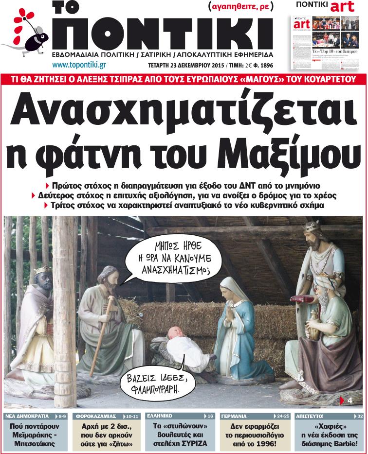 Το «Ποντίκι» κυκλοφορεί εκτάκτως την Τετάρτη, 23 Δεκεμβρίου, με πρωτοσέλιδο τίτλο «Ανασχηματίζεται η φάτνη του Μαξίμου» και αναλυτικό – αποκαλυπτικό ρεπορτάζ για τους στόχους της κυβέρνησης σε διαπραγμάτευση, αξιολόγηση και ανάπτυξη για τη νέα χρονιά μαζί με τον ανασχηματισμό της.