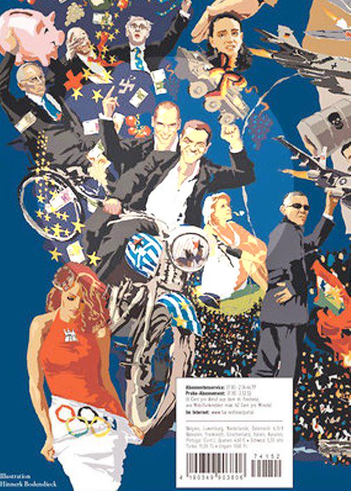 Οι σκιτσογράφοι της FAZ έφτιαξαν ένα ιδιαίτερο εξώφυλλο, στο οποίο ο Α. Τσίπρας και ο Γ. Βαρουφάκης βρίσκονται χαμογελαστοί πάνω σε μια μοτοσικλέτα με τα χρώματα της ελληνικής σημαίας.