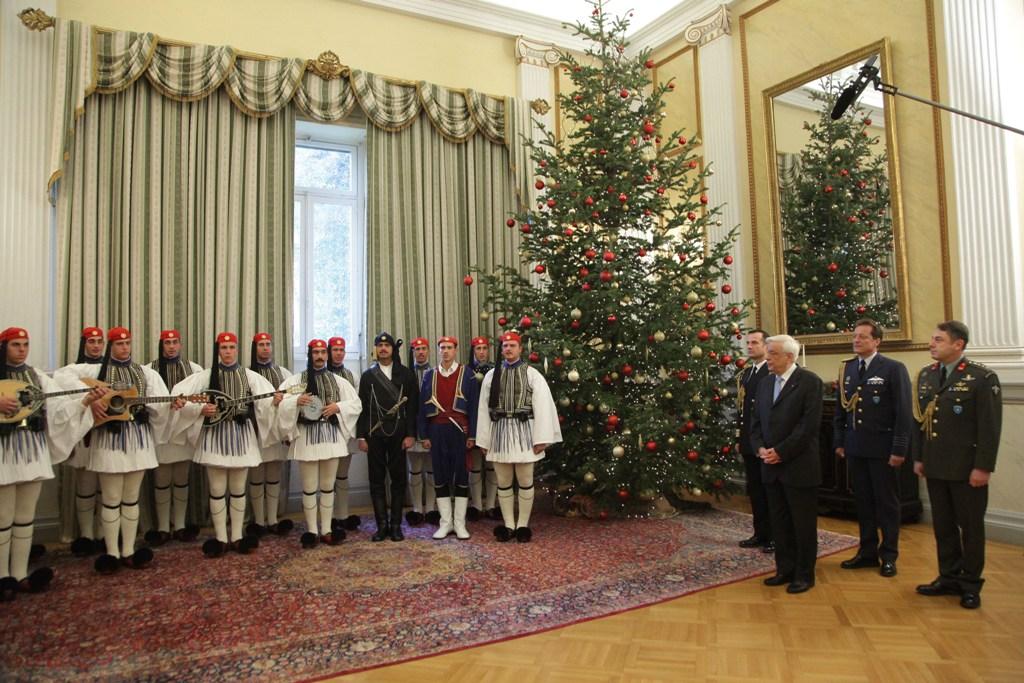 Τα κάλαντα άκουσε και ο πρόεδρος της Δημοκρατίας, Προκόπης Παυλόπουλος, από την μπάντα των ενόπλων δυνάμεων και της Προεδρικής Φρουράς.