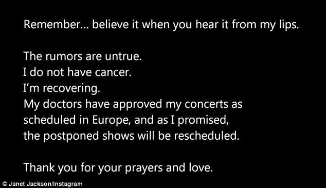«Οι φήμες δεν είναι αληθινές. Δεν έχω καρκίνο. Αναρρώνω». Με αυτό το λακωνικό post στο instagram, η Τζάνετ Τζάκσον ξεκαθαρίζει ότι δεν έχει καρκίνο. Ωστόσο, δεν διευκρινίζει από τι είδους ασθένεια πάσχει. Τις τελευταίες μέρες στο internet είχαν οργιάσει η φήμες ότι έχει καρκίνο στο φάρυγγα.