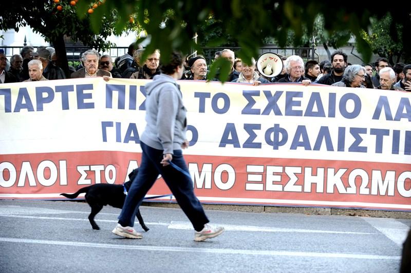 Οι διαδηλωτές σήκωσαν πανό με τα αιτήματά τους, ζητώντας «το έκτρωμα του σχεδίου διάλυσης της Κοινωνικής Ασφάλισης, Κυβέρνησης, επιχειρηματικών ομίλων, Ευρωπαϊκής Ένωσης, να παρθεί πίσω».