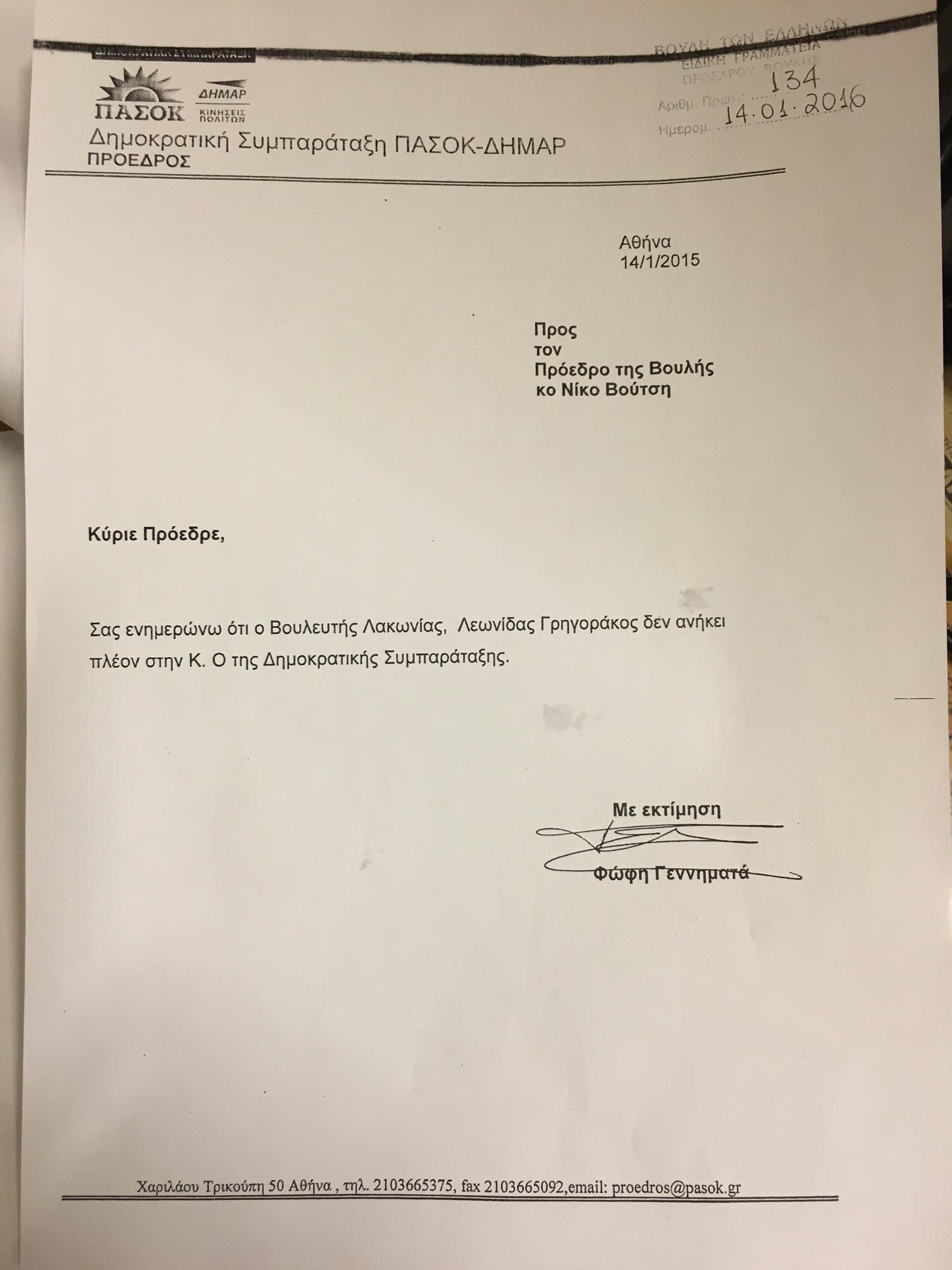 5. Η πρόεδρος του ΠΑΣΟΚ με επιστολή της στον Πρόεδρο της Βουλής γνωστοποίησε ότι ο κος Γρηγοράκος δεν ανήκει πλέον στην Κ.Ο της Δημοκρατικής Συμπαράταξης