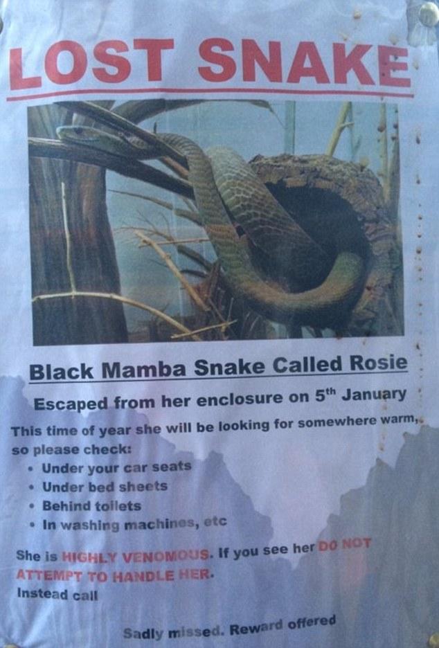 Ένα θανατηφόρο φίδι, μαύρο μάμπα – το οποίο ονομάζεται Ρόζι – έχει χαθεί στο Λονδίνο και ο ιδιοκτήτης του το αναζητά απεγνωσμένα, καλώντας τους ανθρώπους που θα το δουν να μην το πλησιάσουν, όπως φαίνεται σε αφίσα.