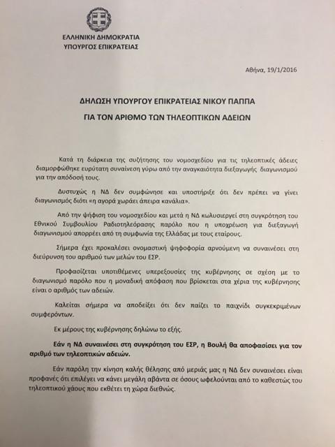 «Εάν η ΝΔ συναινέσει στη συγκρότηση του ΕΣΡ, η Βουλή θα αποφασίσει για τον αριθμό των τηλεοπτικών αδειών. Εάν παρόλη την κίνηση καλής θέλησης από μεριάς μας η ΝΔ δεν συναινέσει είναι προφανές ότι επιλέγει να κάνει μεγάλη αβάντα σε όσους ωφελούνται από το καθεστώς του τηλεοπτικού χάους που εκθέτει τη χώρα διεθνώς», τόνισε ο Νίκος Παππάς.