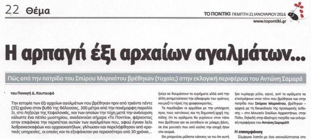 Πως τα αγάλματα αυτά ​, αντί να επιστρέψουν στην Κεφαλονιά στο Μουσείο στο Ληξούρι, στην πατρίδα του μεγάλου Αρχαιολόγου ΣΠΥΡΟΥ ΜΑΡΙΝΑΤΟΥ​, ​μετά από σιωπή των 35 χρόνων, ​όπως περίμεναν οι κάτοικοι, ​​βρέθηκαν στην εκλογική περιφέρεια του Αντώνη Σαμαρά, στην ιδιαίτερη πατρίδα του. Τα μετέφεραν εκεί προσωρινά και έμειναν μόνιμα. Τι ακριβώς έχει γίνει; Που ήταν τα αγάλματα 35 χρόνια ; Ποιοί και γιατί οδήγησαν  στην λύση αυτή ;  Ποιός ήταν ο ρόλος του Αντώνη Σαμαρά όταν ήταν υπουργός Πολιτισμού και αργότερα αρχηγός κόμματος και πρωθυπουργός; Ποιός αντέδρασε στην μεταφορά τους και τι πρέπει να γίνει τώρα ;