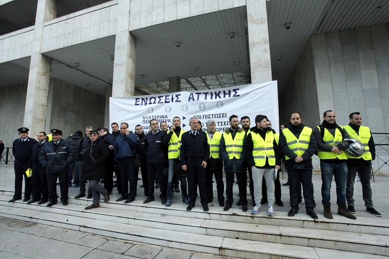 Συγκέντρωση πραγματοποίησαν μέλη των αστυνομικών ενώσεων έξω από τη Γενική Αστυνομική Διεύθυνση Αθηνών διαμαρτυρόμενοι για το ασφαλιστκό.