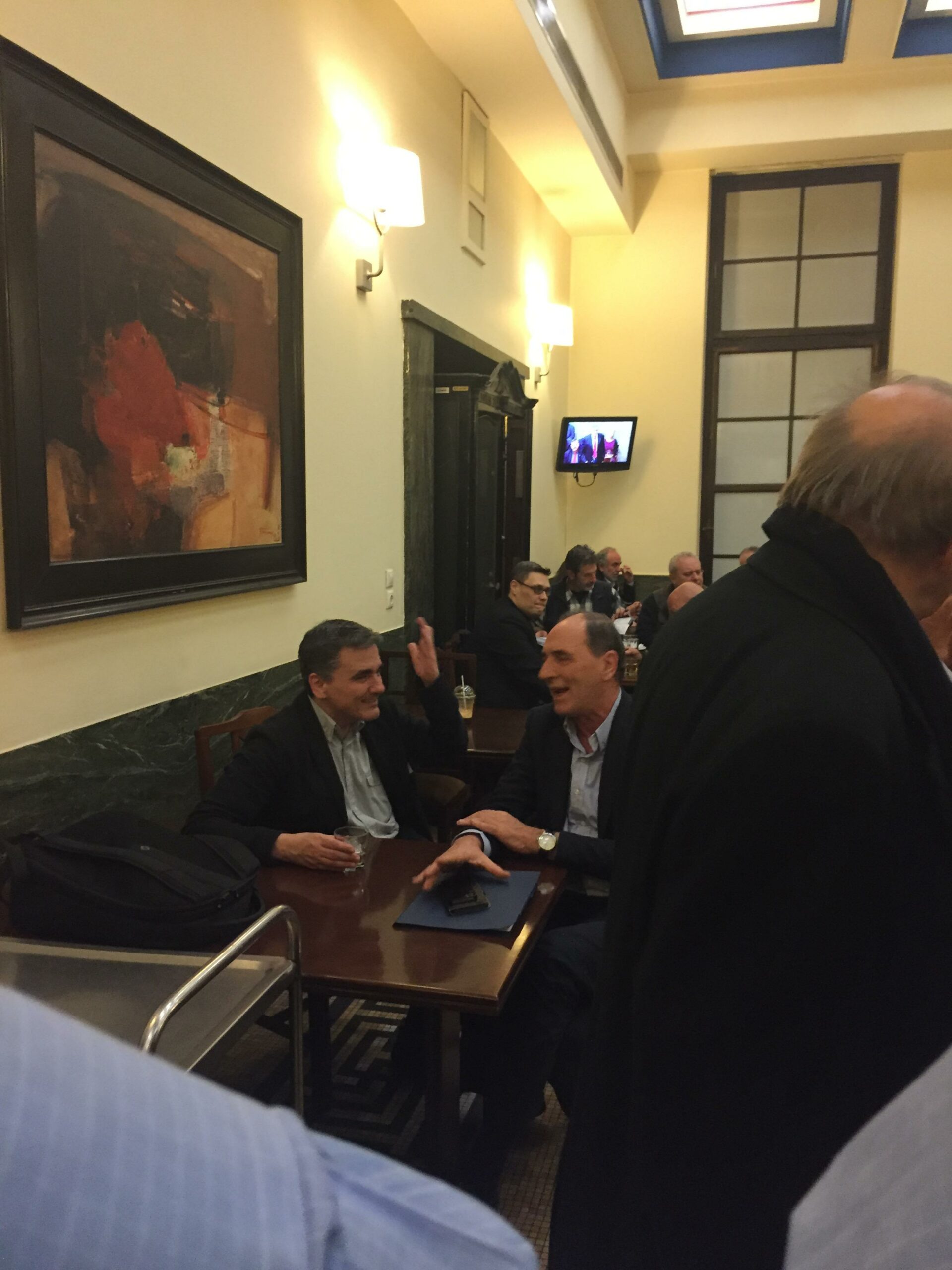 Ο Ευκλείδης Τσακαλώτος και ο Γιώργος Σταθάκης βρήκαν τραπέζι στο καφενείο της Βουλής και έπιασαν την κουβέντα για αρκετή ώρα. Γύρω από τι περιστράφηκε η συζήτηση των δυο υπουργών του οικονομικού επιτελείου της κυβέρνησης πάντως το ξέρουν μόνο οι δυο τους. Και αυτό γιατί, παρά την προσπάθεια, μιλούσαν τόσο χαμηλόφωνα που κανένα αυτί δεν «έπιασε» κάτι από το «μίνι σύσκεψη» που έστησαν οι δυο τους…