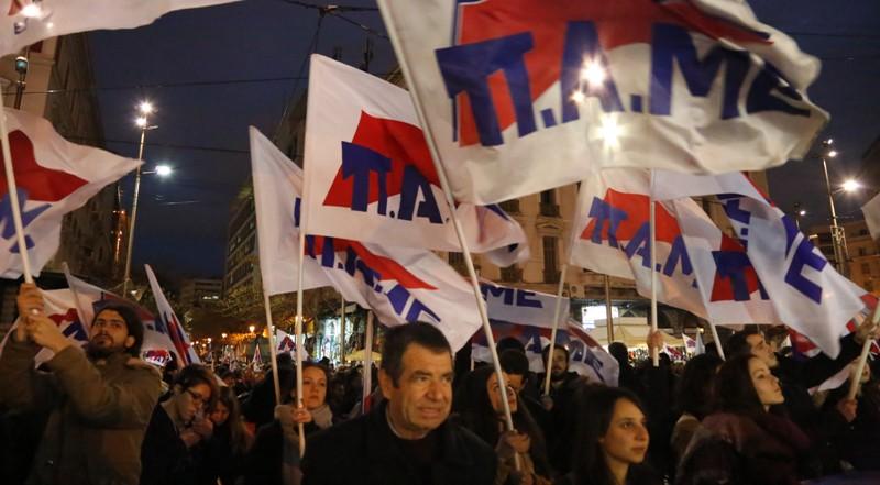 Η μεγάλη πορεία του ΠΑΜΕ, έφτασε έξω από τη Βουλή, με συνθήματα για απόσυρση του νομοσχεδίου για το ασφαλιστικό, όπου συναντήθηκε με τις λίγες δεκάδες που συμμετείχαν στο κάλεσμα της ΑΔΕΔΥ, κυρίως μέλη της Λαϊκής Ενότητας.