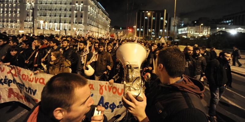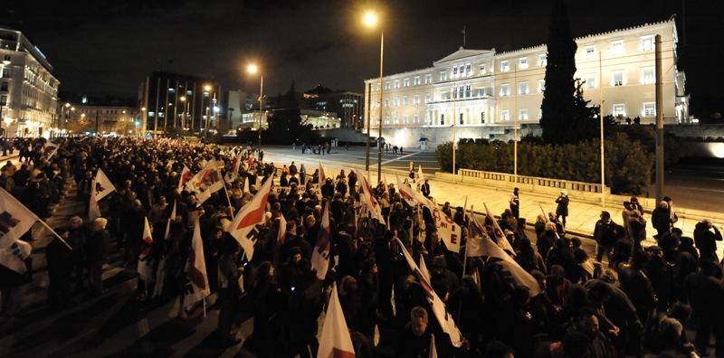 Ιδιαίτερα μαζική παρά το γεγονός πως επρόκειτο για εργάσιμη ημέρα, ήταν η συγκέντρωση που ξεκίνησε από την Ομόνοια και έφτασε έξω από την Βουλή, την ώρα που εντός ξεκινούσε η αντιπαράθεση σε επίπεδο πολιτικών αρχηγών, για το ασφαλιστικό.
