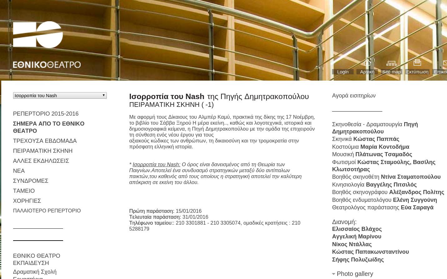 Με σενάριο βασισμένο στο βιβλίο του Σάββα Ξηρού ««Η Μέρα Εκείνη – 1560 ώρες στην εντατική – Μια μαρτυρία για το δικό μας Γκουαντάναμο» και στους Δίκαιους του Καμύ, ανεβαίνει η παράσταση «Ισορροπία του Nash» της Πηγής Δημητρακοπούλου στην Πειραματική Σκηνή του Εθνικού Θεάτρου, προκαλώντας έντονες αντιδράσεις.