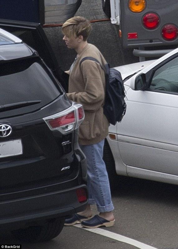 Η 31 ετών ηθοποιός, φορούσε ένα τζιν παντελόνι, μπλέ τσόκαρα, μια μαύρη μπλούζα και ένα καφέ πανοφόρι.