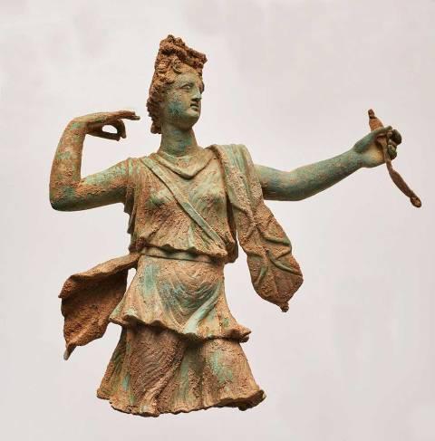 Με ωραία κίνηση, τον χιτώνα της περιποιημένο και τα μαλλιά της χτενισμένα σε μια περίτεχνη κόμμωση, η Αρτεμις, έτοιμη να ρίξει το τόξο της, εντυπωσίασε με τη λεπτομέρειά της τους αρχαιολόγους στην Απτέρα Χανίων.