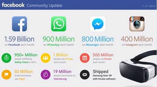 Ο Μαρκ Ζούκερμπεργκ, εφευρέτης και διευθύνων σύμβουλος του Facebook, έκανε μια ανάρτηση με τα νούμερα επισκεπτών τόσο για το Facebook όσο και για τις υπόλοιπες θυγατρικές της εταιρείας και τα νούμερα είναι τρομερά υψηλά. Όπως θα δείτε και στην φωτογραφία, 1,59 δισεκατομμύρια άνθρωποι το επισκέπτονται ανά μήνα.