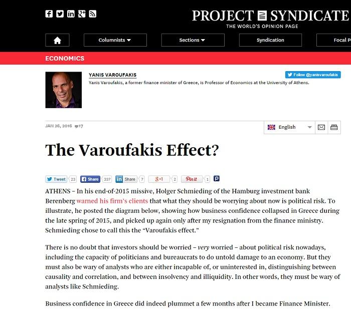 Η εκστρατεία όλων αυτών σύμφωνα με τον πρώην υπουργό Οικονομικών κορυφώθηκε με το διάγραμμα που έδωσε στη δημοσιότητα ο οικονομολόγος του Berenberg, κ. Schmieding που το ονομάζει «ο αντίκτυπος του Βαρουφάκη».