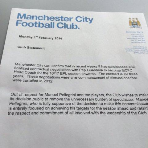 Η Μάντσεστερ Σίτι ανακοίνωσε πως το καλοκαίρι ο Μάνουελ Πελεγκρίνι αποχωρεί από την τεχνική ηγεσία και τη θέση του παίρνει ο Πεπ Γκουαρντιόλα.