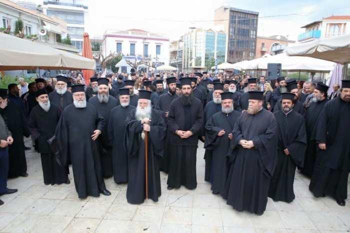 Στο κοντινό Αίγιο στη διαδήλωση βρέθηκε ο Μητροπολίτης Αιγιαλείας, Αμβρόσιος.