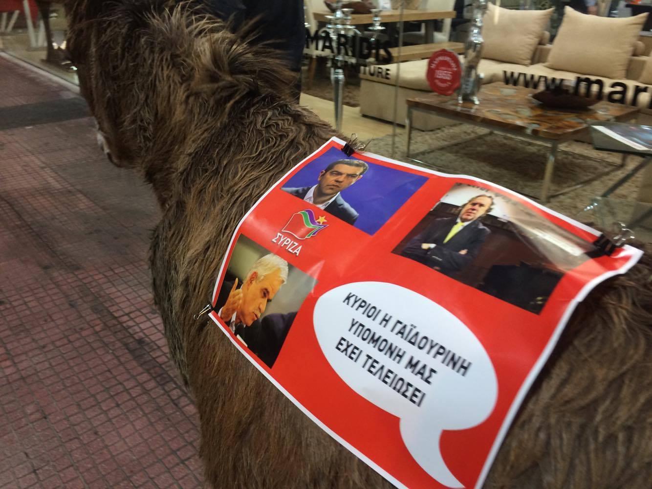 Έτσι, τα άτομα που μετάφεραν το ζώο αποφάσισαν να σταθμεύσουν το όχημά τους λίγο πριν τη Βουλή και αφού κατέβασαν τον γάιδαρο από το φορτηγάκι, του έβαλαν μια αφίσα με τα χρώματα του ΣΥΡΙΖΑ και τα πρόσωπα των κ.κ. Τσίπρα, Κατρούγκαλου και Τόσκα, στην οποία αναγραφόταν: «Κύριοι, η γαϊδουρινή υπομονή μας έχει τελειώσει».