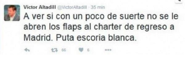 Μακάβριο χιούμορ; Όπως και να έχει με αυτά δεν παίζουν και δεν κάνουν πλάκα. Κι έτσι ο Βίκτορ Αλταντίγ την ώρα που θα στέκεται στην ουρά του ισπανικού… ΟΑΕΔ θα σκέφτεται ότι ίσως δεν ήταν τόσο αστείο αυτό που έγραψε στον προσωπικό λογαριασμό του στο Twitter ευχόμενος να μην φτάσει ποτέ στον προορισμό του το αεροπλάνο της Ρεάλ, που μετέφερε την αποστολή της ομάδας πίσω στη Μαδρίτη μετά το παιχνίδι με τη Γρανάδα.