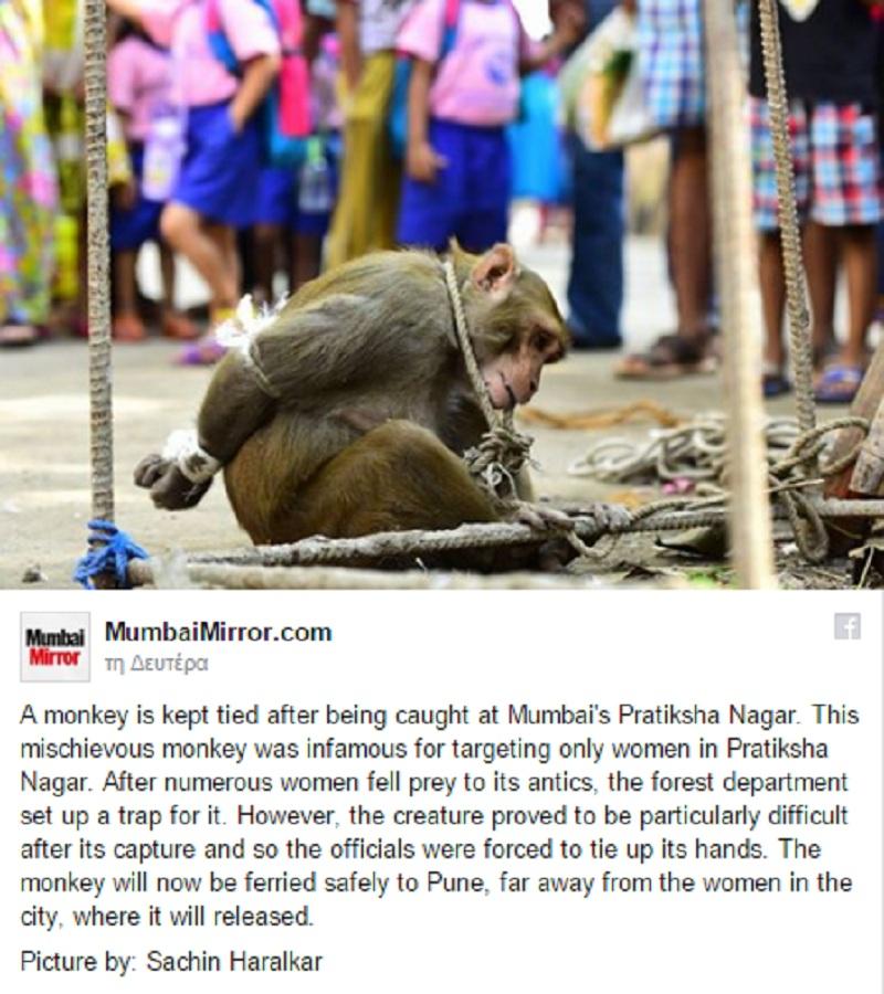 Στη Βομβάη της Ινδίας, ένας πίθηκος μακάκος, είχε γίνει ο φόβος και ο τρόμος των γυναικών. Εμφανιζόταν από τα πυκνά φυλλώματα του δάσους και κρεμασμένος σε κλαδιά έκλεβε μέσα από τις τσάντες όσων γυναικών περνούσαν, ότι έβρισκε. Φρούτα, τρόφιμα, ζαχαρωτά… Κάποιες φορές έκλεβε και τις ίδιες τις τσάντες.