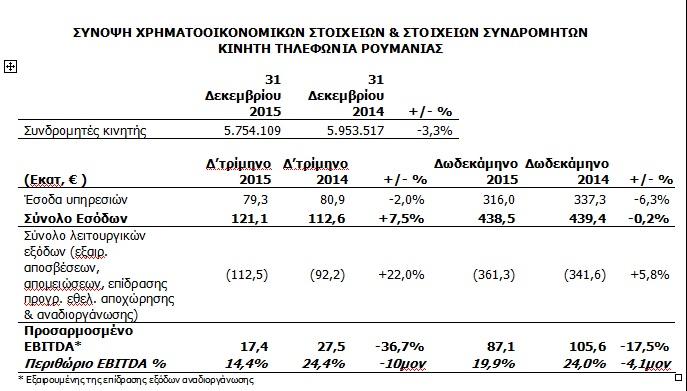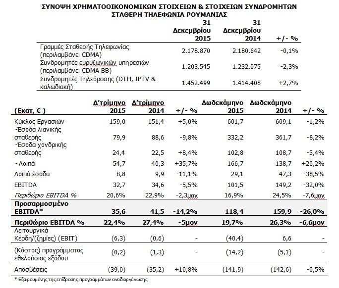 Το Δ’ τρίμηνο του 2015, η εταιρεία συνέχισε να δίνει έμφαση στις συνδυαστικές υπηρεσίες σταθερής και κινητής, με τα έσοδα κινητής να υπερδιπλασιάζονται και την πελατειακή βάση να τετραπλασιάζεται σε ετήσια βάση. Τα έσοδα σταθερής τηλεφωνίας Ρουμανίας στο Δ’ τρίμηνο του 2015 αυξήθηκαν κατά 5% λόγω των υψηλότερων εσόδων από υπηρεσίες χονδρικής και ICT, καθώς και της κατασκευής δικτύου ευρυζωνικής πρόσβασης στις αγροτικές περιοχές επιδοτούμενο από την Ε.Ε.