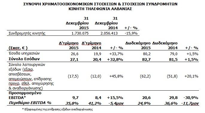 Η κερδοφορία EBITDA αυξήθηκε κατά 15,5% το Δ΄ τρίμηνο του 2015, σε σχέση με το Δ΄ τρίμηνο του 2014, παρά την αρνητική επίδραση των αυξημένων εξόδων διασύνδεσης, λόγω των αυξημένων εσόδων και της αποτελεσματικής διαχείρισης του κόστους.