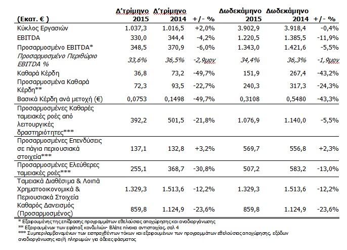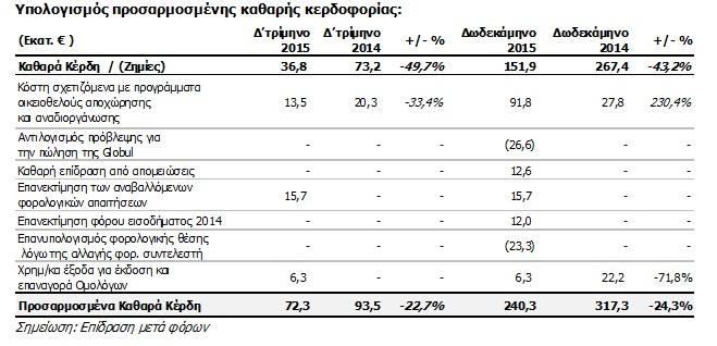 Εξαιρουμένων των εκτάκτων χρεώσεων, τα προσαρμοσμένα Καθαρά Κέρδη του Ομίλου θα είχαν ανέλθει σε €240,3 εκατ. το 2015, μειωμένα κατά 24,3% σε σχέση με πέρυσι. Το τέταρτο τρίμηνο, τα προσαρμοσμένα Καθαρά Κέρδη μειώθηκαν κατά 22,7% και ανήλθαν σε €72,3 εκατ.