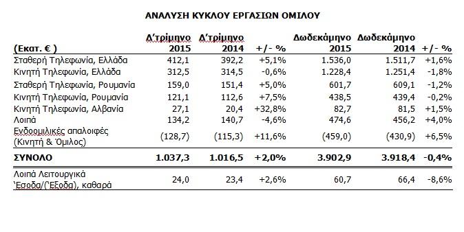 Το Δ’ τρίμηνο του 2015, τα ενοποιημένα έσοδα του Ομίλου σημείωσαν αύξηση 2% σε σχέση με το Δ’ τρίμηνο του 2014, παρά το δύσκολο οικονομικό και ανταγωνιστικό περιβάλλον. Η σταθερή τηλεφωνία Ελλάδας κατέγραψε εντυπωσιακές επιδόσεις, με έσοδα ενισχυμένα κατά 5,1%, ως αποτέλεσμα των ισχυρών επιδόσεων στις ευρυζωνικές υπηρεσίες και υπηρεσίες ICT, καθώς και στη σημαντική αύξηση στα έσοδα του OTE TV, που ενισχύονται από τη δυναμική αύξηση των συνδρομητών και τον σημαντικά υψηλότερο δείκτη ARPU. Στις δραστηριότητες κινητής τηλεφωνίας στην Ελλάδα σημειώθηκε περαιτέρω βελτίωση σε τριμηνιαία βάση, με τη μείωση εσόδων να διαμορφώνεται συνολικά σε 0,6% το Δ’ τρίμηνο του 2015, από μείωση 3,1% το προηγούμενο τρίμηνο.