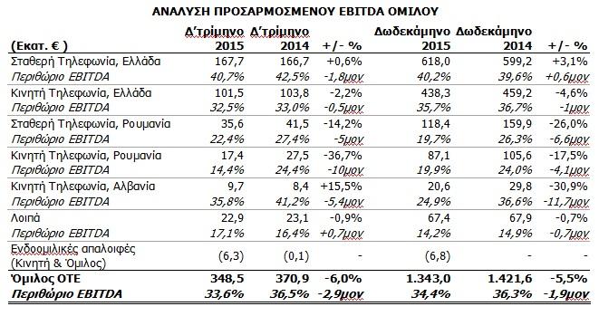 Το προσαρμοσμένο EBITDA αυξήθηκε κατά 0,6% το Δ’ τρίμηνο 2015 και διαμορφώθηκε σε €167,7 εκατ. ως αποτέλεσμα των ισχυρών εσόδων. Κατά συνέπεια το προσαρμοσμένο περιθώριο EBITDA, στη σταθερή τηλεφωνία Ελλάδας, αυξήθηκε σε 40,2% το 2015, αυξημένο κατά 60 μονάδες βάσης σε σχέση με το 2014.