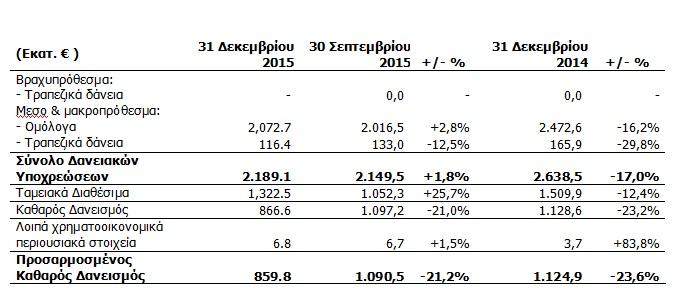 Ο προσαρμοσμένος καθαρός δανεισμός του Ομίλου διαμορφώθηκε σε λιγότερο από €0,9 δισ. στις 31 Δεκεμβρίου 2015, μειωμένος κατά 23,6% σε σχέση με τις 31 Δεκεμβρίου του 2014, που αντιστοιχεί σε 0,6 φορές το προσαρμοσμένο ετήσιο ΕΒΙTDA του Ομίλου.