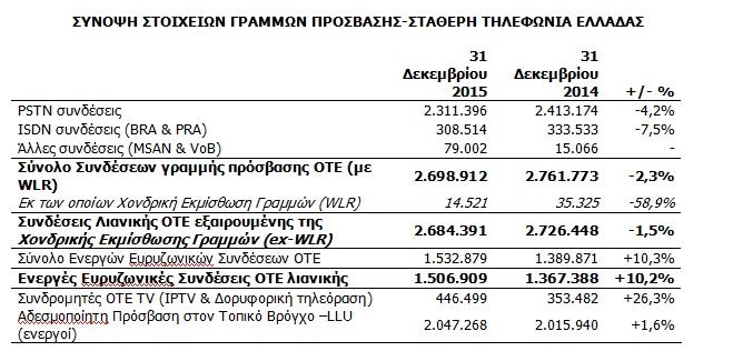 Το Δ’ τρίμηνο του 2015, η συνολική αγορά πρόσβασης στην Ελλάδα (ενεργοί συνδρομητές λιανικής ΟΤΕ, χονδρική εκμίσθωση γραμμών και συνδρομητές πλήρους Αδεσμοποίητης Πρόσβασης στον Τοπικό Βρόχο) κατέγραψε αύξηση 10.000 γραμμών. Ο ΟΤΕ κατέγραψε 8.000 καθαρές νέες συνδέσεις, η πρώτη καθαρή αύξηση μετά από 10 χρόνια πτώσης.