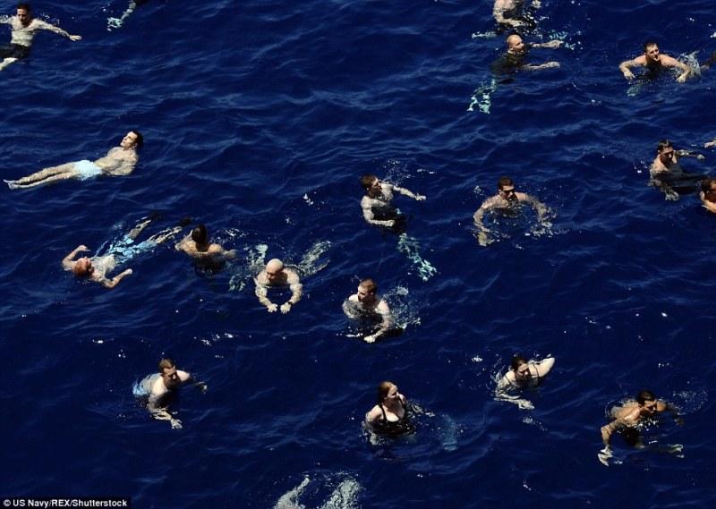 Κάποιοι αξιωματικοί παραμένουν στο κατάστρωμα και ελέγχουν μήπως και στα νερά εμφανιστούν καρχαρίες, ή άλλοι θηρευτές.