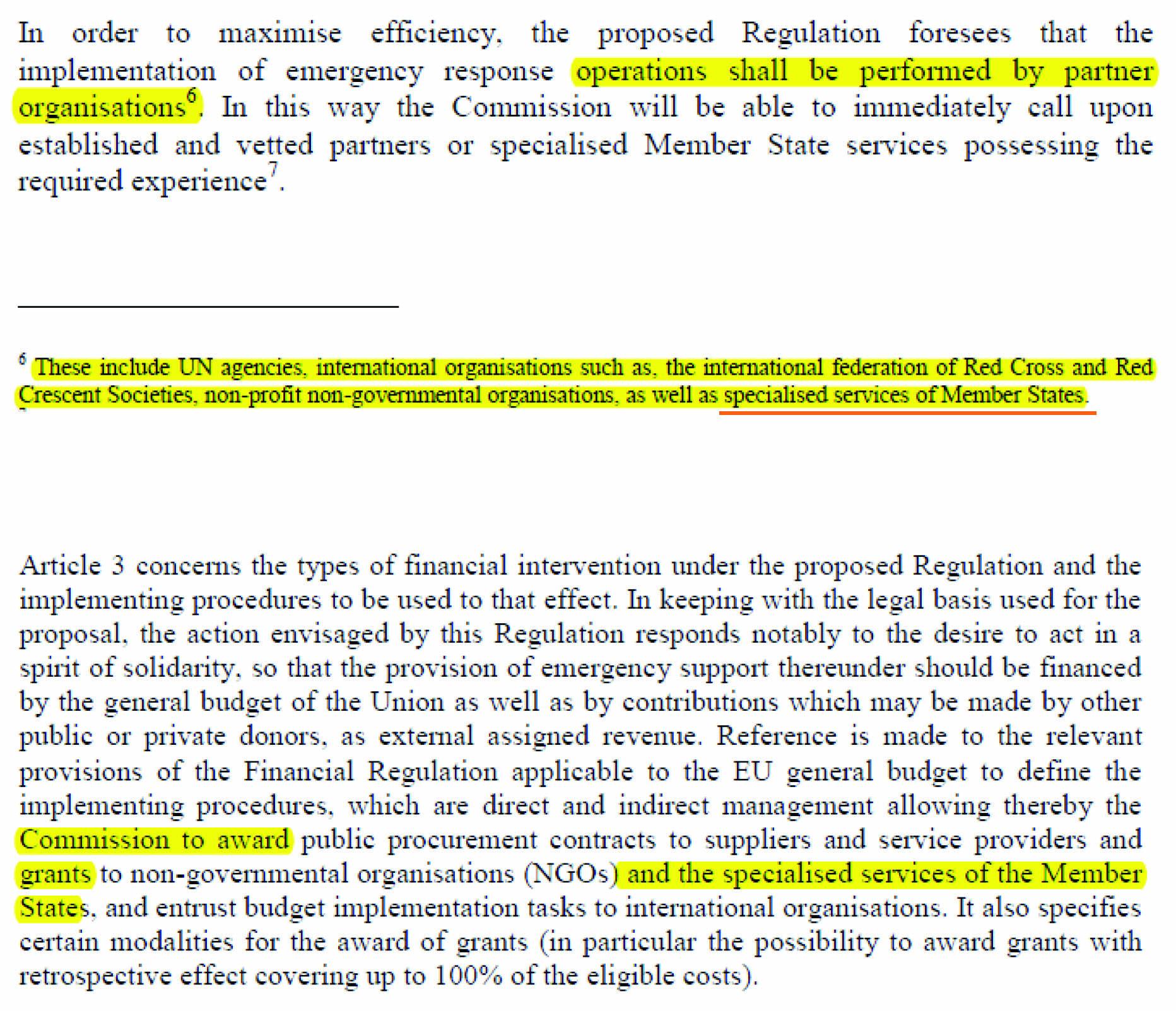 “Και επειδή”, όπως προσθέτουν οι ίδιες πηγές, “από δημοσιογραφική δεοντολογία μπορεί να μη γνωρίζουν αλλά αγγλικά σίγουρα θα γνωρίζουν”, παραθέτουν το σχετικό απόσπασμα από το αγγλικό κείμενο για το νέο μέσο έκτακτης βοήθειας, όπου αναφέρεται στο άρθρο 3 ότι «η Επιτροπή επιτρέπεται να επιχορηγεί και τις εξειδικευμένες υπηρεσίες των Κρατών-Μελών». Αναφέρεται επίσης, μεταξύ άλλων, και ότι για την βέλτιστη αποτελεσματικότητα ο προτεινόμενος Κανονισμός προβλέπει ότι οι επιχειρήσεις έκτακτης βοήθειας θα γίνονται μεταξύ άλλων και από τις “εξειδικευμένες υπηρεσίες των Κρατών-Μελών”.