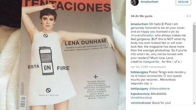 Σεναριογράφος, σκηνοθέτης και ηθοποιός, η Λένα Ντουνχάμ ξέρει ότι δεν κάνει καριέρα χάρης στα φυσικά της προσόντα, αλλά χάρης στο μυαλό και το ταλέντο της. Έτσι, η 29χρονη τα «έχωσε» στο ισπανικό περιοδικό «Tentaciones» γιατί την φιλοξένησε στο εξώφυλλο του αλλοιώνοντας εντελώς την εικόνα της, με την βοήθεια βέβαια, του photoshop.