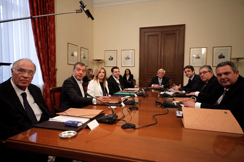 Έξι στιγμιότυπα από τη κρίσιμη σύσκεψη του Συμβουλίου των Πολιτικών Αρχηγών, υπό τον Πρόεδρο της Δημοκρατίας, στο Προεδρικό Μέγαρο.