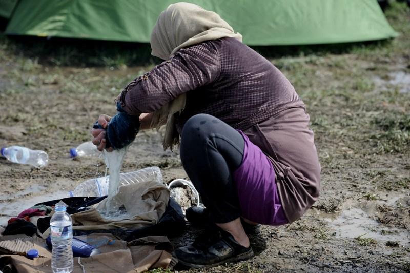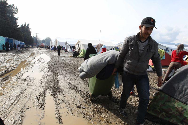 Η χθεσινή νεροποντή μετέτρεψε τον καταυλισμό σε έναν απέραντο λασπότοπο και μούσκεψε όλες τις κουβέρτες και τα πράγματα των προσφύγων, οι οποίοι πέρασαν ένα ολόκληρο βράδυ, προσπαθώντας να προστατέψουν τα παιδιά τους από την καταιγίδα.