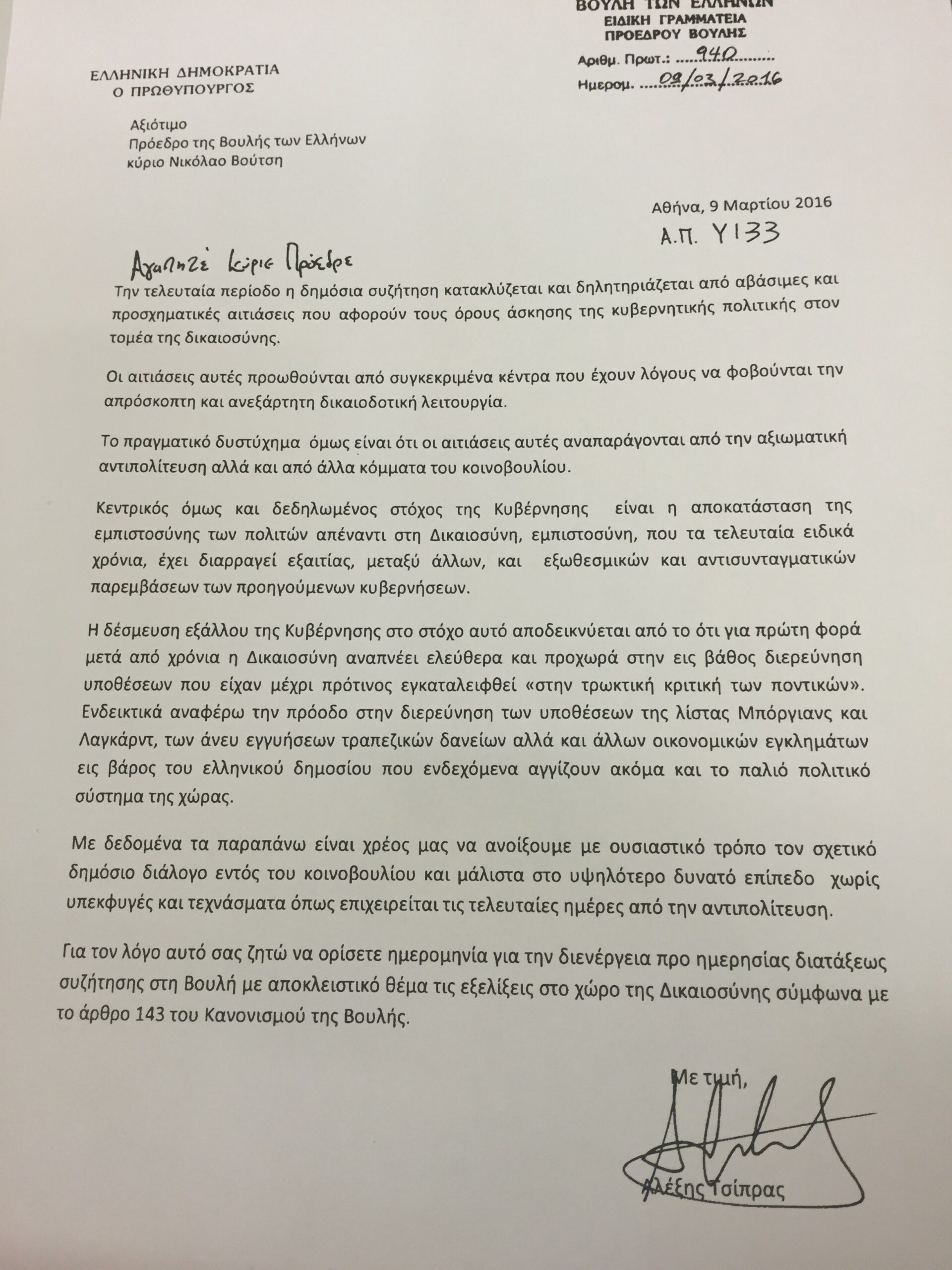 Ειδικότερα, με επιστολή του ο πρωθυπουργός Αλέξης Τσίπρας ζητά από τον Πρόεδρο της Βουλής Νίκο Βούτση την διεξαγωγή προ ημερησίας διατάξεως συζήτηση στη Βουλή με αποκελιστικό θέμα τις εξελίξεις στο χώρο της Δικαιοσύνης σύμφωνα με το άρθρο 143 του Κανονισμού της Βουλής.