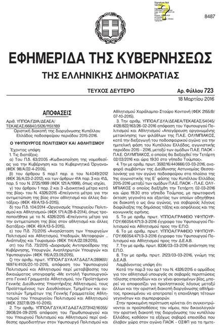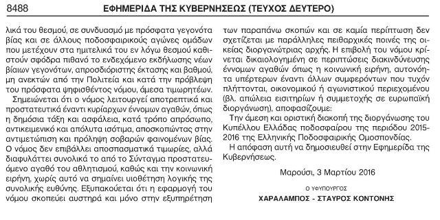 Επίσημη μορφή πήρε η απόφαση Κοντονή για οριστική διακοπή του Κυπέλλου. Λίγες ώρες μετά την προειδοποίηση της FIFA για επανεκκίνηση εντός δυο εβδομάδων, έγινε η σχετική δημοσίευση και στο ΦΕΚ.