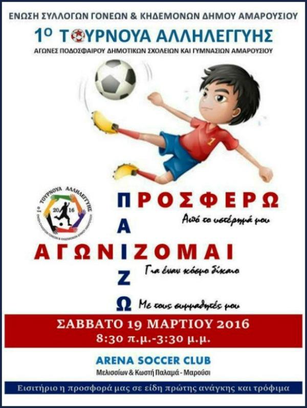 Ποδοσφαιρικό Τουρνουά Αλληλεγγύης διοργάνωσε η Ένωση Συλλόγων Γονέων και Κηδεμόνων στο Μαρούσι το Σάββατο, 19 Μαρτίου, με τη συμμετοχή 12 Δημοτικών Σχολείων και 5 Γυμνασίων.