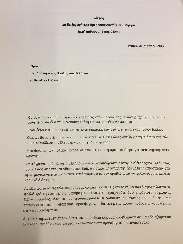 Η ΝΔ με αίτημα της προς τον πρόεδρο της Βουλής Νίκο Βούτση ζητά την διεξαγωγή προ ημερησίας συζήτησης στη Βουλή με θέμα την ασφάλεια των πολιτών. «Ειδικά για την Ελλάδα γίνεται αναπόδραστη η ανάγκη εξέτασης του ζητήματος ασφάλειας στις νέες συνθήκες που βιώνει η χώρα εξ’ αιτίας της δραματικής κατάστασης στο προσφυγικό-μεταναστευτικό, κατάστασης που δεν προβλέπεται να βελτιωθεί για μεγάλο χρονικό διάστημα», σημειώνει η «γαλάζια» παράταξη, μεταξύ άλλων, στο αίτημα της, συνδέοντας το προσφυγικό με την ασφάλεια στην χώρα μας.