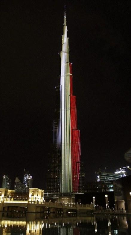 Ο πύργος Burj Khalifa στο Ντουμπάι. Ο πύργος φωτίστηκε από τη μια πλευρά στα χρώματα της σημαία του Βελγίου και από την άλλη στα χρώματα της σημαίας της Ε.Ε.