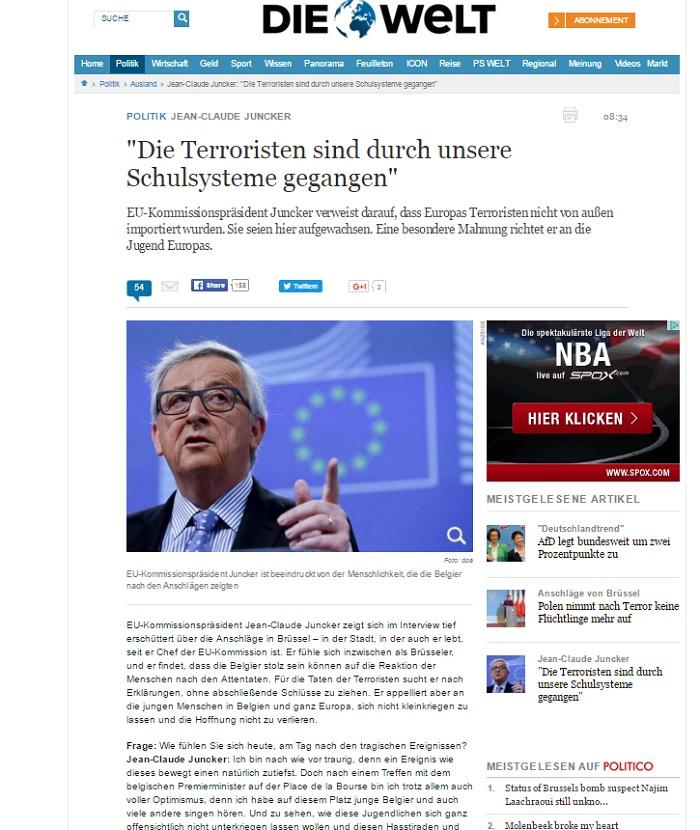 «Φαίνεται ως εάν η τρομοκρατία, η οποία μας χτυπά σήμερα, να ήταν εισαγόμενη, αλλά εκείνοι οι οποίοι διαπράττουν αυτές τις πράξεις γεννήθηκαν στην πραγματικότητα εδώ, συχνά μάλιστα και οι γονείς τους. Πέρασαν από τα σχολεία μας και έλαβα ενεργά μέρος στην κοινωνική μας ζωή. Δίνουν την εντύπωση μόνο ότι έρχονται από αλλού, ενώ είναι από δω» είπε o Ζαν Κλοντ Γιουνκέρ σε κοινή συνέντευξή του στη γερμανική εφημερίδα «Die Welt», την ιταλική «La Repubblica», την ισπανική «El Pais», τη βελγική «Le Soir», τη γαλλική «Le Figaro» και τις ελβετικές «La Tribune de Geneve» und «Der Tagesanzeiger».