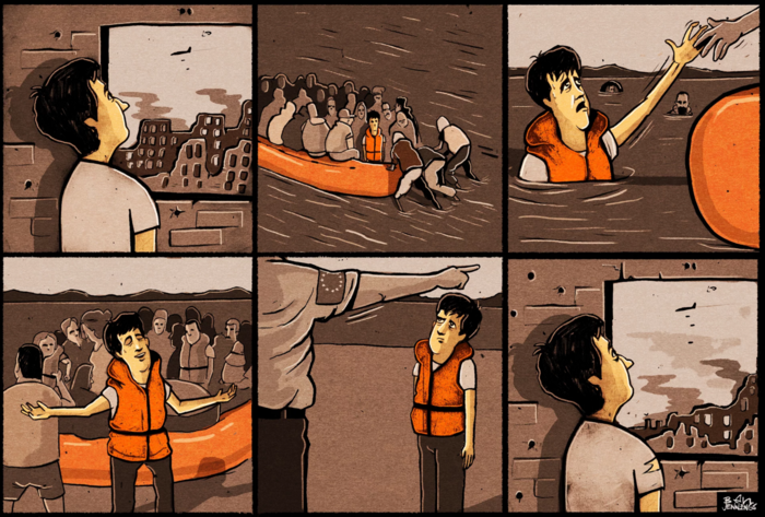 Στο σκίτσο του παρουσιάζει την πορεία που ακολουθεί ένας πρόσφυγας από τα παράλια της Τουρκίας στην Ελλάδα στην κατεστραμμένη από τον πόλεμο πατρίδα τους.