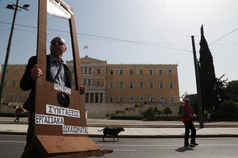 Στη θέση του θύματος αναγράφονταν «μισθοί», «συντάξεις», «εργασιακά δικαιώματα», η λεπίδα έγραφε «μέτρα».