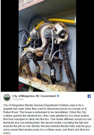 Αντιμέτωποι με μια διαφορετική εικόνα ήρθαν δύο ηλεκτρολόγοι στη Βόρεια Καρολίνα όταν πήγαν να αποσυνδέσουν το ρεύμα σε ένα σπίτι που επρόκειτο να κατεδαφιστεί.Οι ηλεκτρολόγοι αφού έφτασαν στο σπίτι, πήγαν στο κουτί παροχής ηλεκτρισμού. Ανοίγοντας το κουτί δεν πίστευαν στα μάτια τους με αυτό που αντίκρισαν! Δυο μεγάλα φίδια μπλεγμένα στα καλώδια. Ευτυχώς για καλή τους τύχη τα φίδια ήταν ήδη νεκρά λόγω ηλεκτροπληξίας.