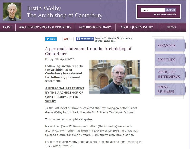 «Τον περασμένο μήνα ανακάλυψα πως ο βιολογικός μου πατέρας δεν είναι ο Γκάβιν Ουέλμπι, αλλά στην ουσία είναι ο μακαρίτης πλέον Σερ Άντονι Μόνταγκιου Μπράουν», αναφέρει στην επίσημη ιστοσελίδα του ο 60χρονος αρχιεπίσκοπος.
