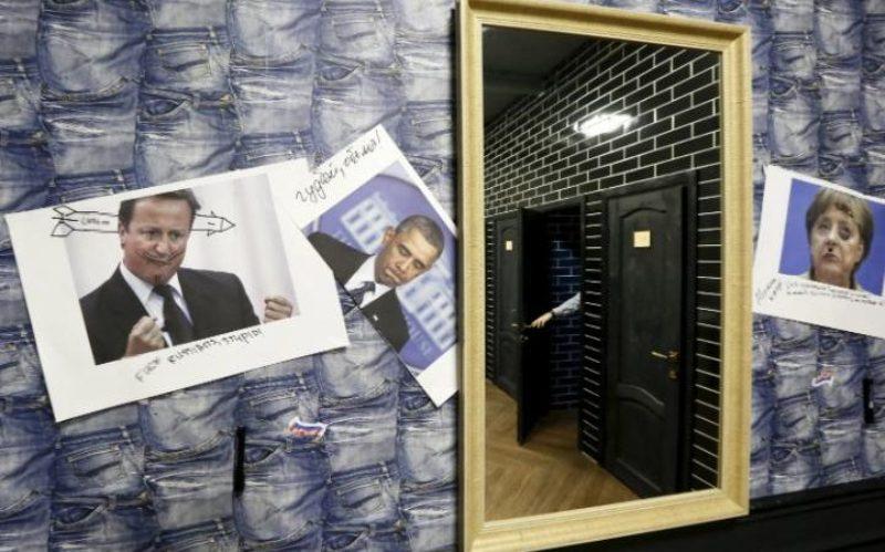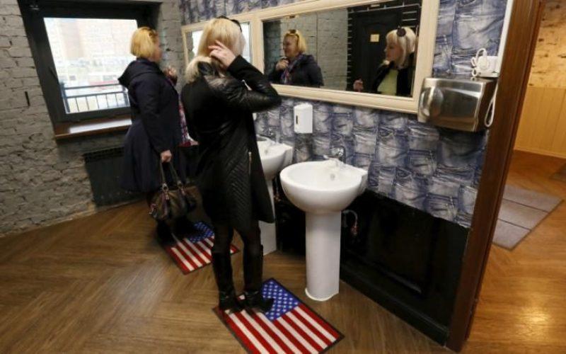 Οι θαμώνες παρακολουθούν μέσα από τις φωτογραφίες την πορεία του προέδρου της Ρωσίας από την παιδική του ηλικία μέχρι το Κρεμλίνο, σκουπίζουν τα πόδια τους σε πατάκια με την αμερικανική σημαία και χρησιμοποιούν χαρτί τουαλέτας με τη χαμογελαστό είδωλο του Ομπάμα.